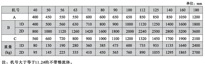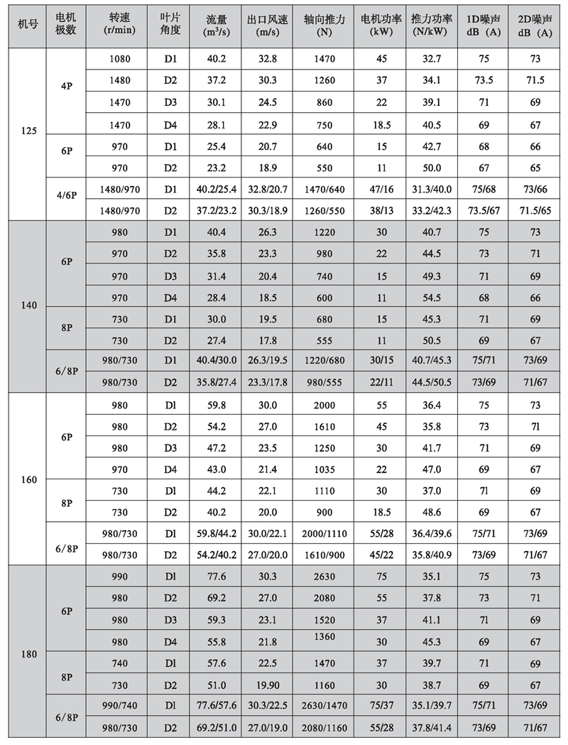 5)性能參數表中所列噪聲值為在野外、距風機出口10米、45度角處測量的A聲級